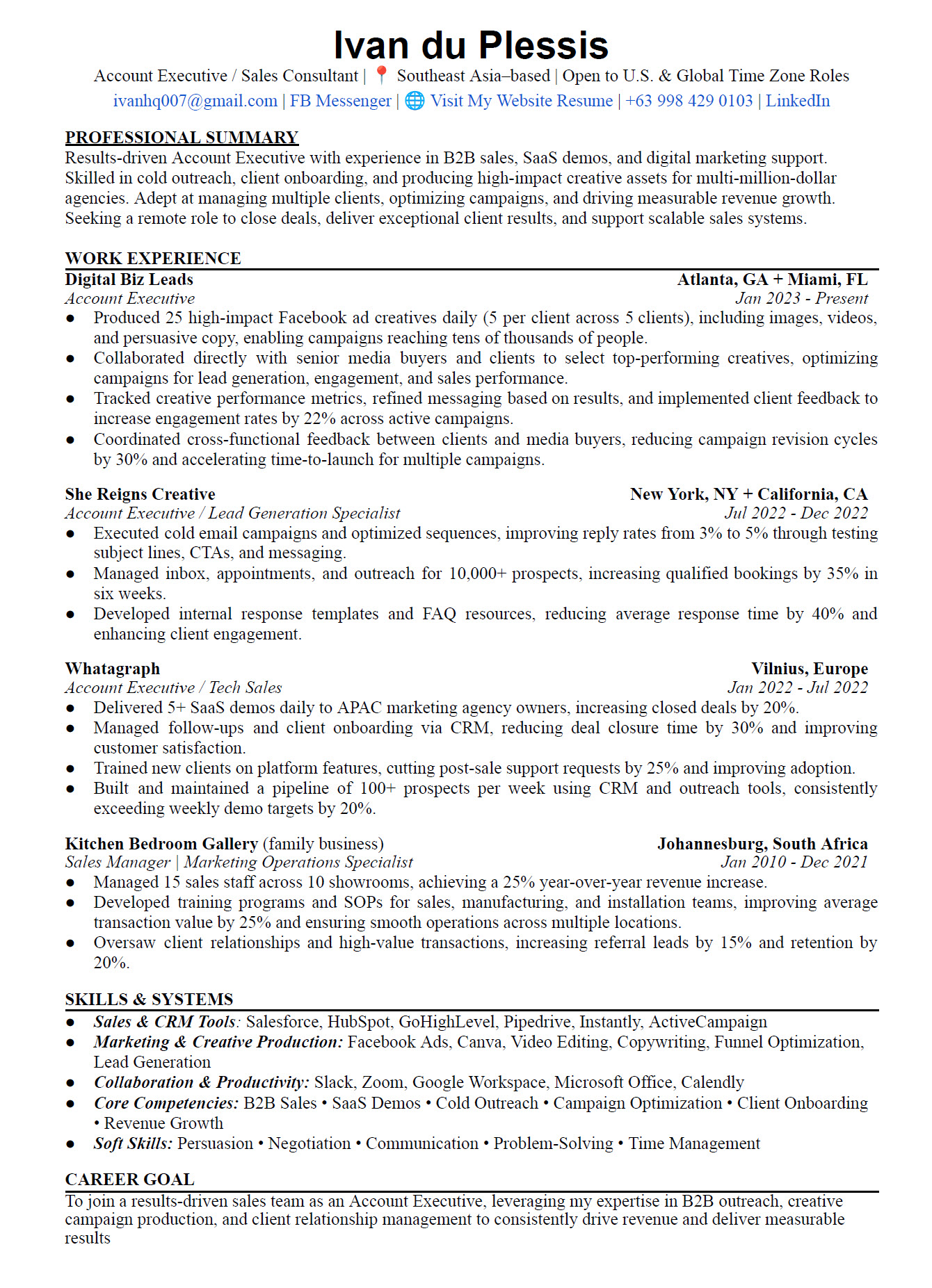 1.) Click Here – Resume for “Account Executive / Sales Consultant”