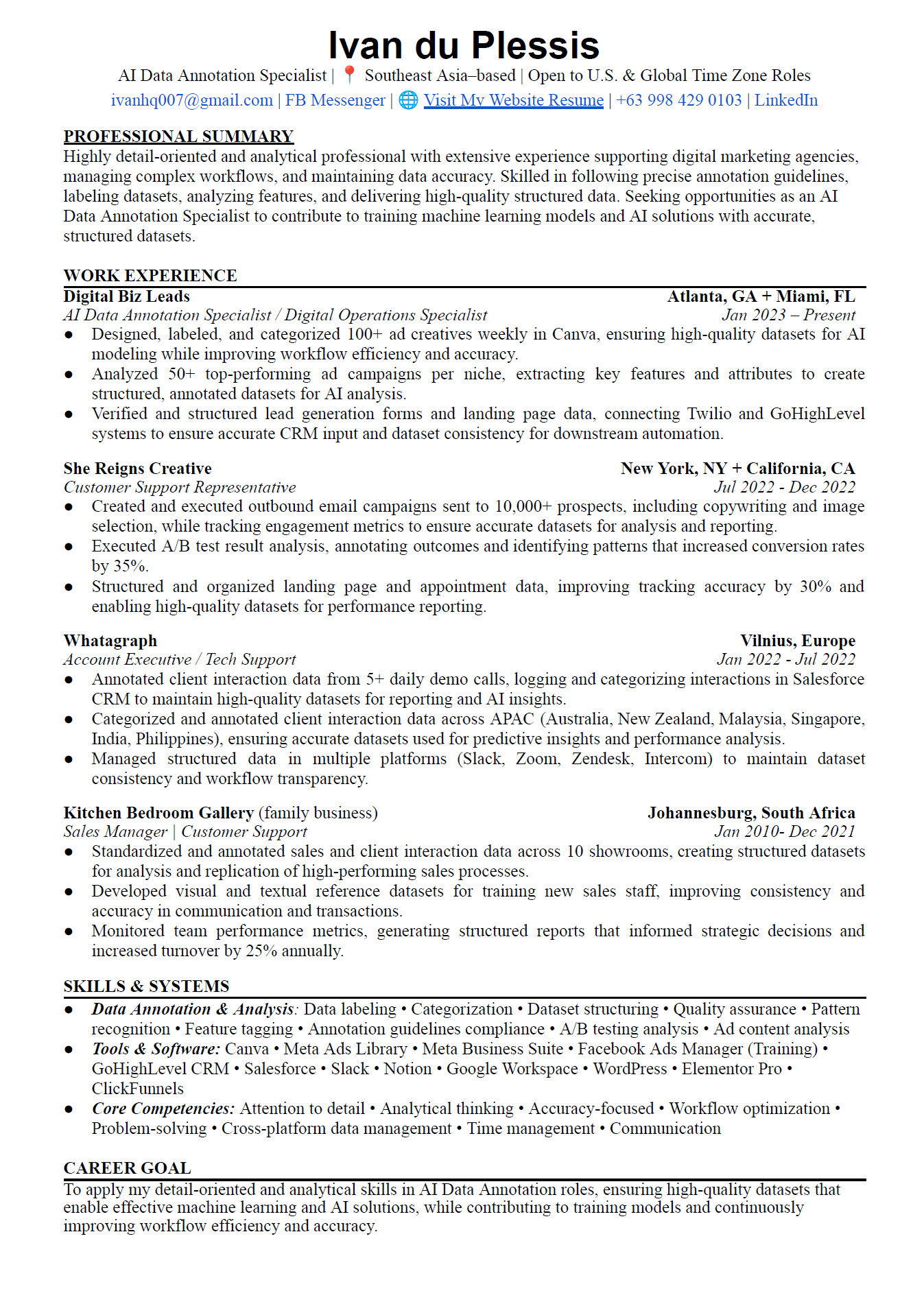 Attention to detail • Analytical thinking • Accuracy-focused • Workflow optimization • Problem-solving • Cross-platform data management • Time management • Communication