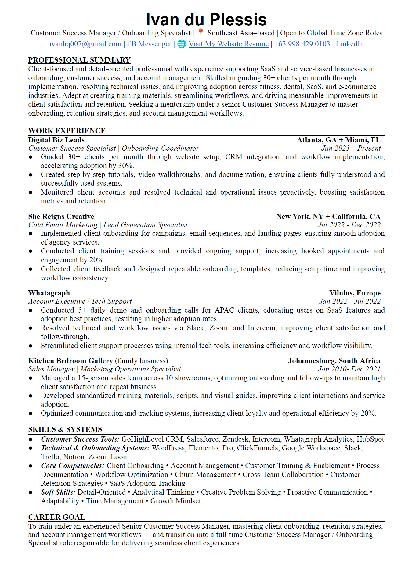 1.) Click Here – Resume for “Customer Success Manager / Onboarding Specialist”