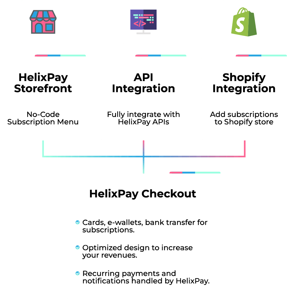 Top-left: A diagram illustrating HelixPay’s robust subscription management features.