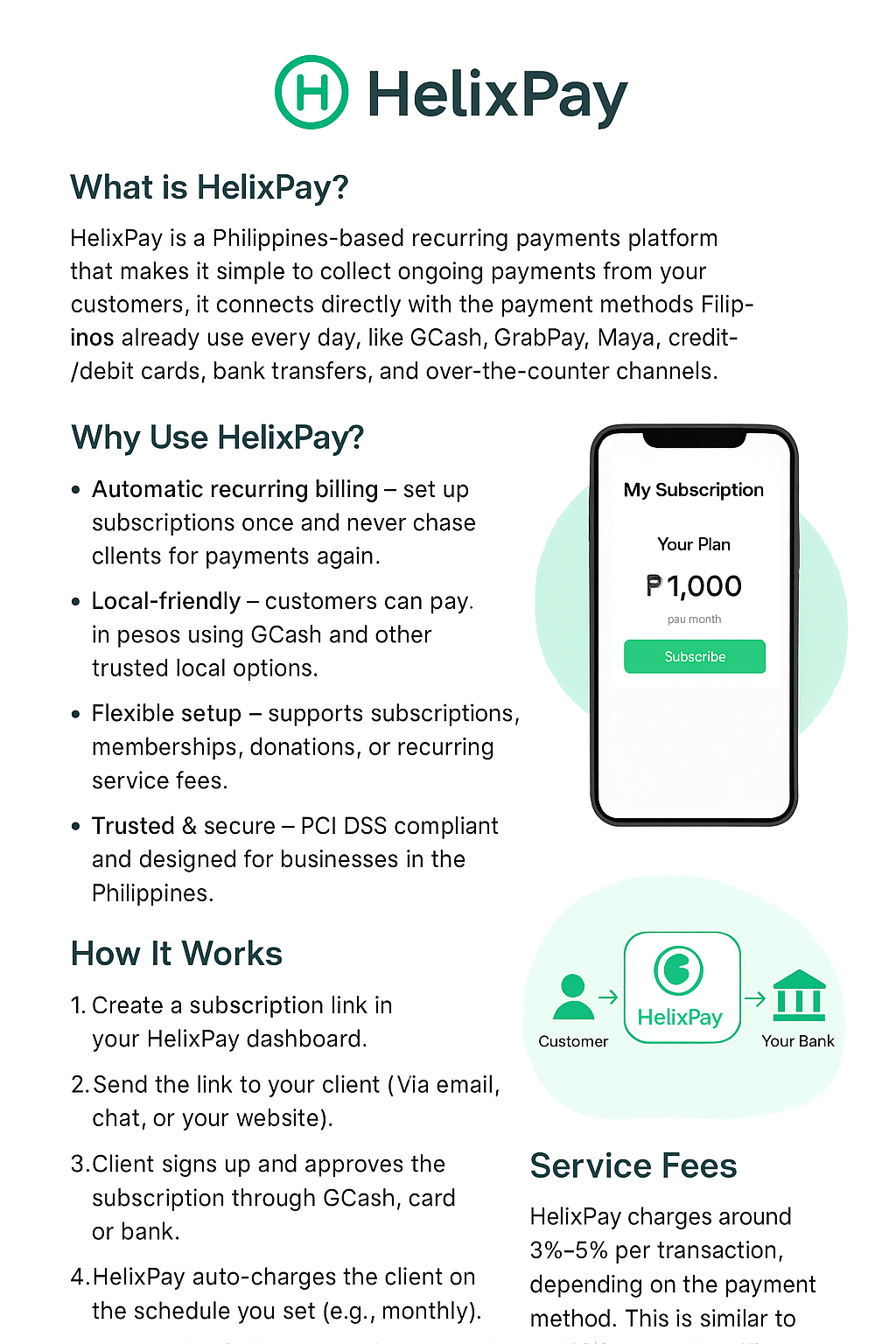 HelixPay is the first subscription management platform built for the Philippines, tailored for local businesses, creators, and service providers who wish to collect recurring payments with ease.helixpay.ph+1Foxmont