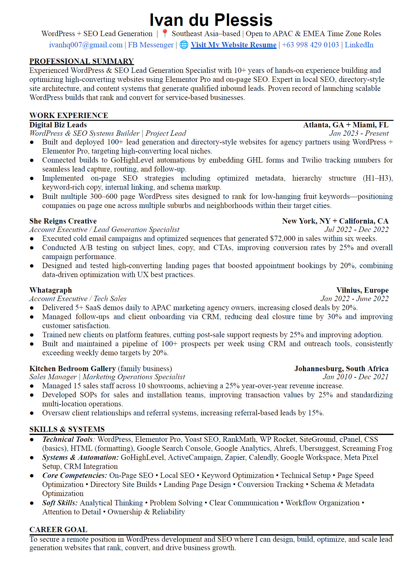 1.) Click Here – Resume for “WordPress + SEO Lead Generation”